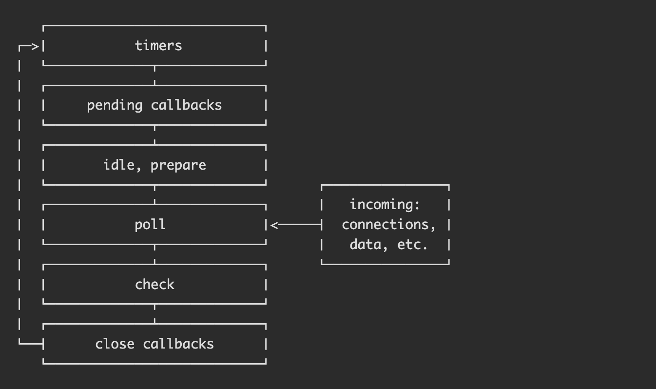 poll: retrieve new I/O events; execute I/O related callbacks (almost all with the exception of close callbacks, the ones scheduled by timers, and setImmediate()); node will block here when appropriate.